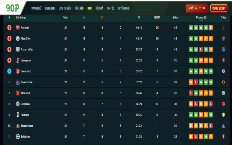 Ngoài ra, lịch thi đấu và bảng xếp hạng được cập nhật thường xuyên theo từng vòng đấu, hỗ trợ người hâm mộ theo dõi toàn cảnh mùa giải một cách hệ thống. Các dữ liệu như phong độ đội bóng, lịch sử đối đầu hay vị trí trên bảng xếp hạng đều được trình bày khoa học, rõ ràng, giúp việc tra cứu trở nên nhanh chóng và thuận tiện.